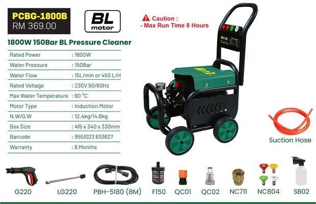 HITZ 150 BAR MAX 1800W INDUCTION MOTOR HIGH PRESSURE CLEANER PCBG-1800B