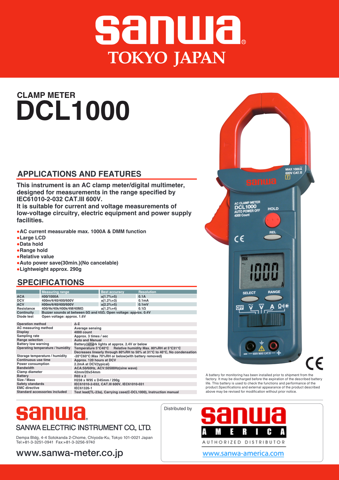 | Product SKU | SANWA DCL1000 Digital Clamp Meter & Multimeter CAT III 600 V |